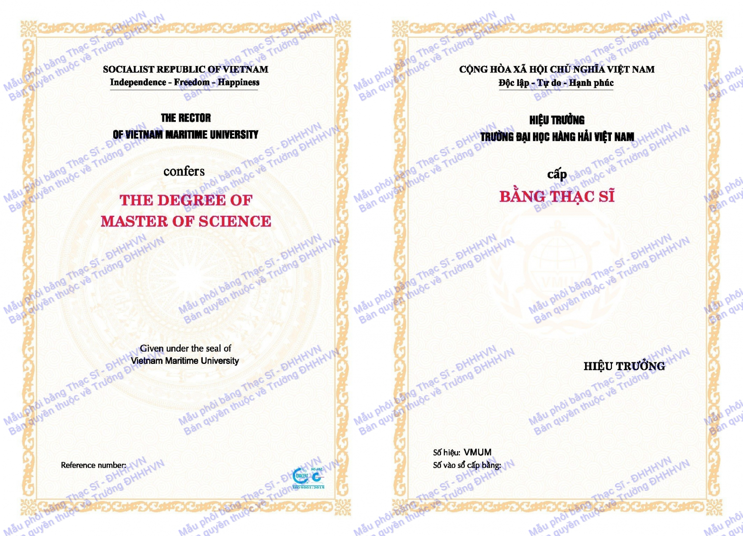 Mẫu văn bằng Thạc sỹ của Trường Đại học Hàng hải Việt nam