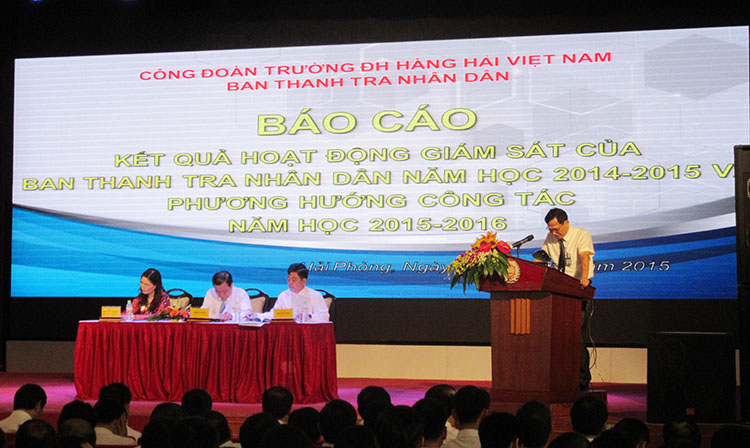 ThS.Phạm Trọng Tài- Trưởng ban Thanh tra nhân dân báo cáo kết quả hoạt động giám sát của Ban thanh tra nhân dân năm học 2014-2015 về các mặt như công tác đào tạo huấn luyện, nghiên cứu khoa học, giám sát việc thực hiện các chế độ chính sách của người lao động đồng thời chỉ ra những ưu điểm, hạn chế và phương hướng công tác năm học 2015-2016.