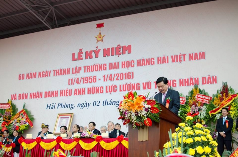 Phát biểu chỉ đạo tại buổi lễ trọng thể này, đồng chí Đinh La Thăng nhiệt liệt chúc mừng Trường Đại học Hàng hải Việt Nam được đón nhận danh hiệu anh hùng lực lượng vũ trang nhân dân. Hơn bất cứ cơ sở đào tạo nào khác, Trường Đại học Hàng hải Việt Nam phải chủ động và can đảm gánh trọng trách đào tạo nguồn nhân lực chất lượng cao cho ngành hàng hải Việt Nam. Cùng với lộ trình trở thành một trong 17 trường trọng điểm quốc gia, nằm trong top 10 trường đại học quy mô lớn nhất Việt Nam năm 2020, đạt trình độ ngang bằng với các trường hàng hải của Asian năm 2025 và đạt trình độ Châu Á Thái Bình Dương vào năm 2030. Đồng chí mong muốn Nhà trường tích cực tham gia mạnh mẽ vào quá trình hình thành nguồn nhân lực nói chung và nguồn nhân lực hàng hải nói riêng. Nguồn nhân lực ấy phải có trình độ chuyên môn cao, kĩ năng làm việc tốt, có kỷ luật, có sự hiểu biết quốc tế, đổi mới dạy và học và phải làm tốt hơn nữa. Chúng ta không nên ngủ quên trên những thành tích ấy thay vào đó là quá trình phấn đấu liên tục, không mệt mỏi, không bao giờ thỏa mãn. Thời gian tới đây, để thể hiện vai trò hàng đầu trong khu vực đào tạo, Nhà trường cần có những sáng kiến cụ thể của riêng mình nhằm góp phần đổi mới giáo dục quốc gia, tham gia tích cực hình thành thị trường lao động chất lượng cao đặc biệt lĩnh vực chuyên môn độc đáo đòi hỏi hàm lượng chất xám lớn mà Nhà trường có thế mạnh vượt trội. Trước mắt Nhà trường cần triển khai thật tốt Nghị quyết TW8 khóa 11 về “ Đổi mới căn bản giáo dục và đào tạo” với những giải pháp, bước đi hết sức cụ thể, hiệu quả và thiết thực chú trọng mục tiêu hình thành và phát triển phẩm chất, năng lực tự học, khuyến khích sự chủ động, sáng tạo của học viên, sinh viên. Nhà trường cần đẩy nhanh, hoàn thiện công tác quản trị theo hướng tự chủ hội nhập quốc tế. Tiếp tục đổi mới, nâng cao chất lượng chương trình, bài giảng, tài liệu học tập, cần phải gắn kết nội dung đào tạo, hoạt động đào tạo của Nhà trường với doanh nghiệp, người tuyển dụng. Đẩy nhanh công tác chuẩn hóa cán bộ quản lý và đội ngũ giảng viên, chủ động tranh thủ thu hút nguồn đầu tư cho cơ sở vật chất phục vụ giảng dạy, học tập, mở rộng liên kết, trao đổi đào tạo với sinh viên quốc tế. Đồng chí tin tưởng sau sự kiện này, Trường Đại học Hàng hải Việt Nam sẽ nhanh chóng đạt được mục tiêu của mình là trở thành một thương hiệu lớn về đào tạo nguồn nhân lực, nghiên cứu khoa học biển của khu vực và thế giới.