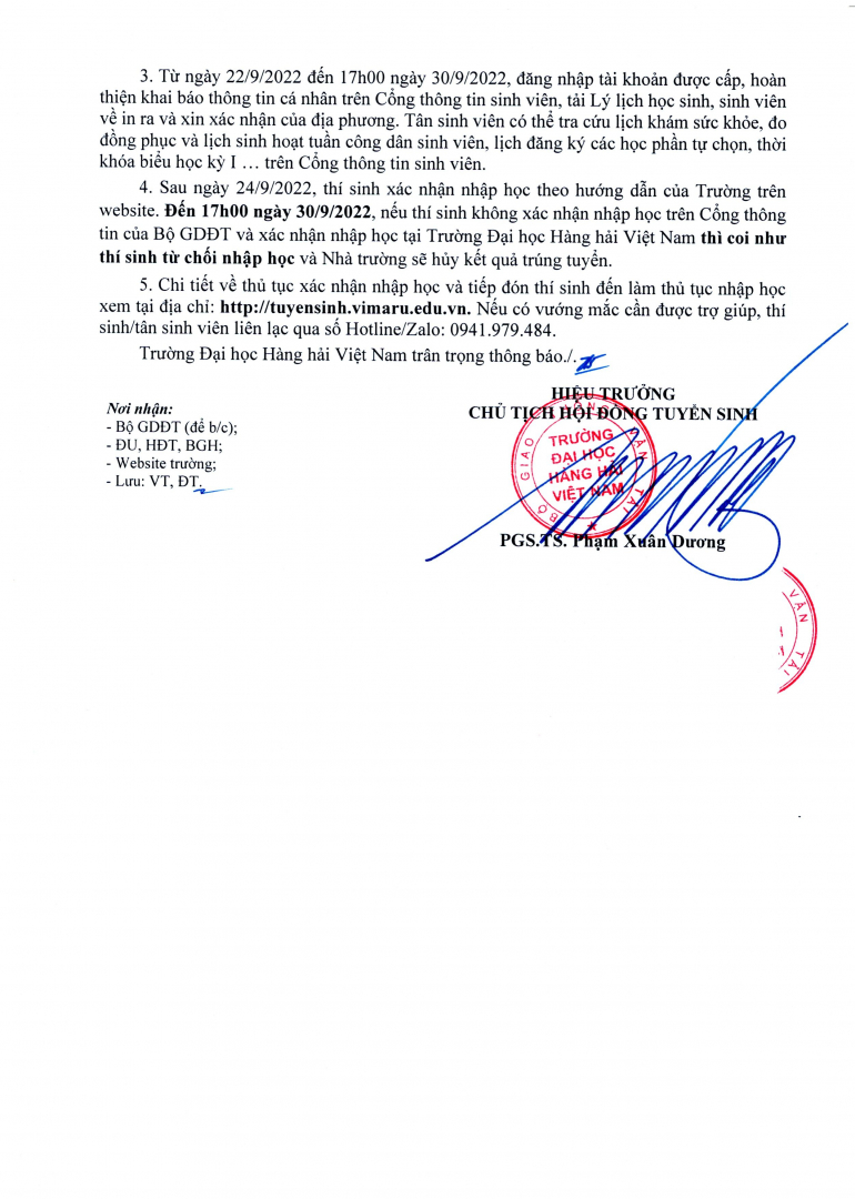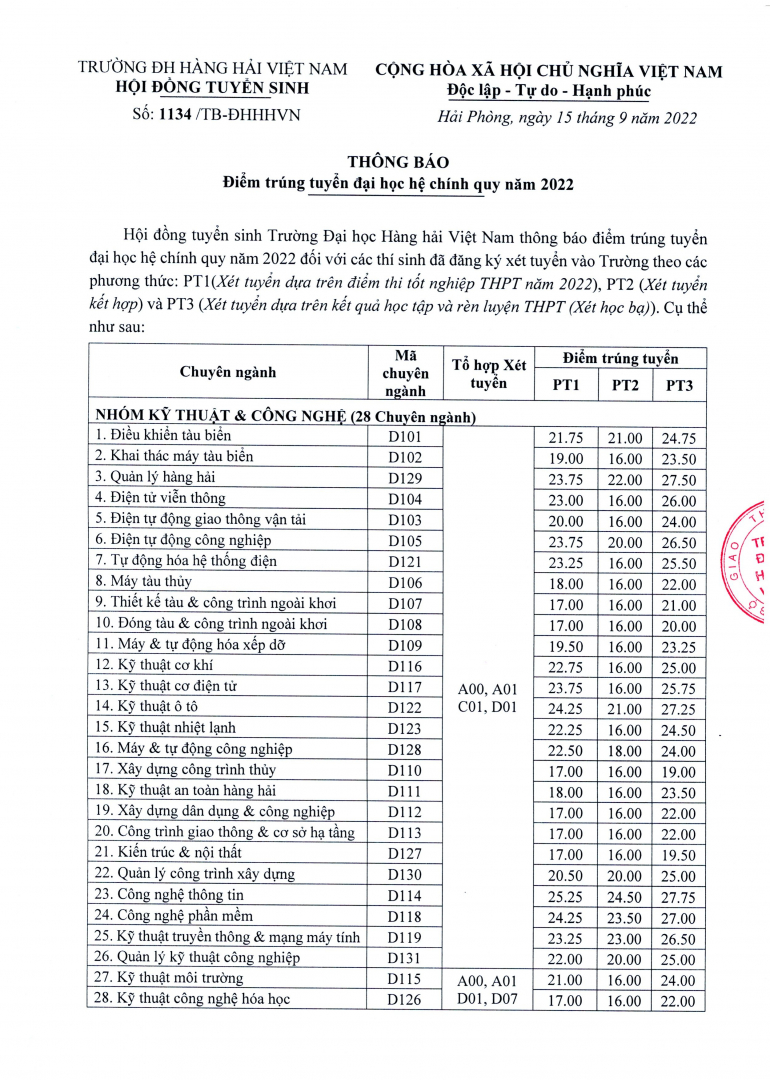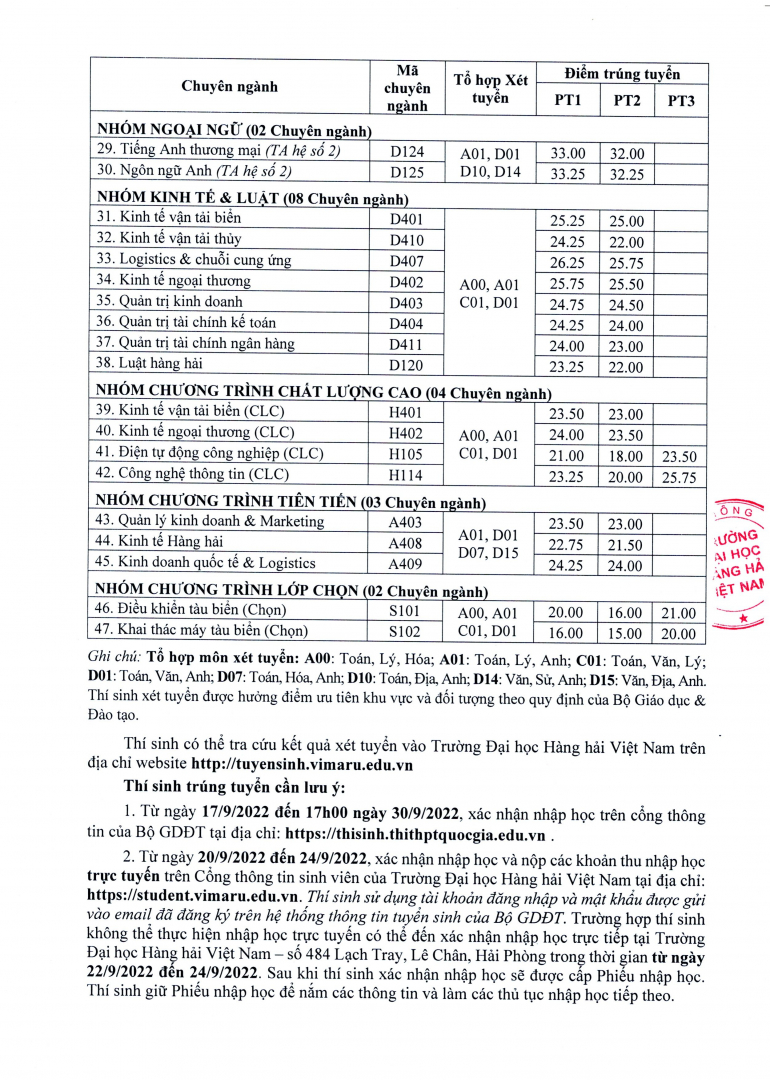 Thông báo điểm trúng tuyển đại học hệ chính quy năm 2022 của Trường Đại học Hàng hải Việt Nam