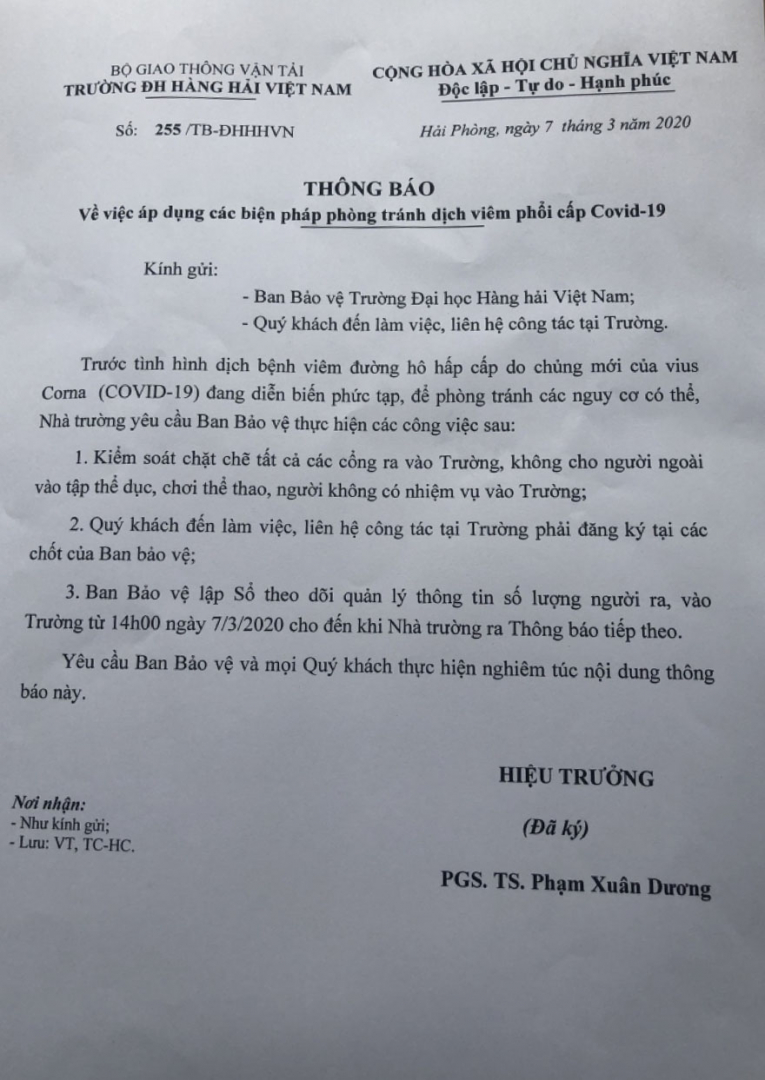 Thông báo về việc áp dụng các biện pháp phòng tránh dịch viêm phổi cấp Covid-19