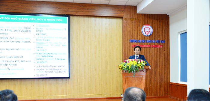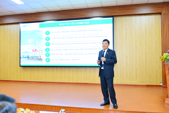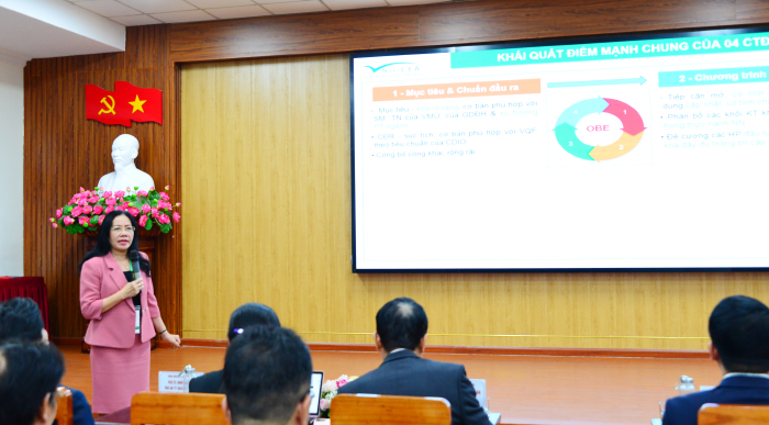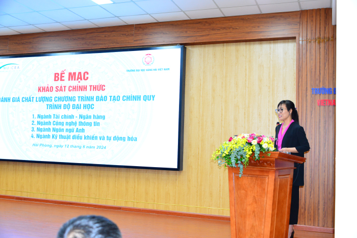 Cũng tại lễ bế mạc, GS.TS. Mai Trọng Nhuận cùng TS. Nguyễn Thị Thu Hương - Thư ký Đoàn và TS. Đinh Văn Toàn - Thành viên thường trực báo cáo cụ thể với 11 tiêu chuẩn và 50 tiêu chí, nêu bật định hướng đào tạo giáo dục hướng tới chuẩn đầu ra; những phương pháp tiếp cận, cấu trúc và nội dung CTĐT nhằm mục đích cải tiến, nâng cao hơn nữa chất lượng đào tạo phục vụ sinh viên, học viên của Trường Đại học Hàng hải Việt Nam, hướng tới mục tiêu xây dựng văn hóa chất lượng Nhà trường.