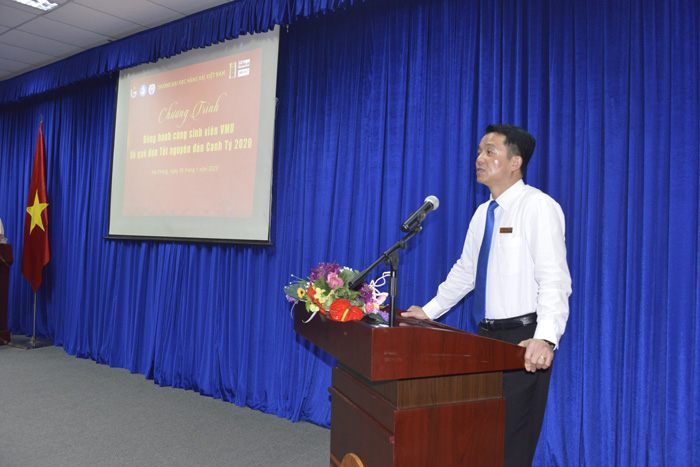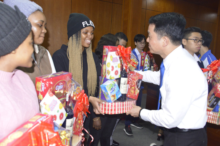 Phát biểu tại buổi gặp mặt, PGS.TS Nguyễn Khắc Khiêm - Phó Hiệu trưởng Nhà trường điểm qua những thành tựu mà Nhà trường đã đạt được trong năm qua đồng thời ghi nhận những nỗ lực cố gắng trong học tập của các em lưu học sinh. Qua đây Thầy gửi lời chúc các em đón Tết vui vẻ, hạnh phúc, ấm cúng và đầy ý nghĩa cùng đất nước, con người Việt Nam. Cũng trong buổi gặp gỡ này, Thầy đã trao quà cho 48 lưu học sinh trong đó có 40 sinh viên quốc tế và 8 học viên cao học đang học tập tại Trường Đại học Hàng hải Việt Nam đến từ Lào, Campuchia, Angola, Nigeria, Hàn Quốc, Mozambique, Nam Phi và Bắc Triều Tiên....cùng 30 sinh viên có hoàn cảnh khó khăn.