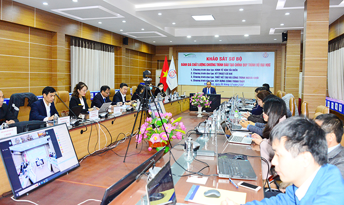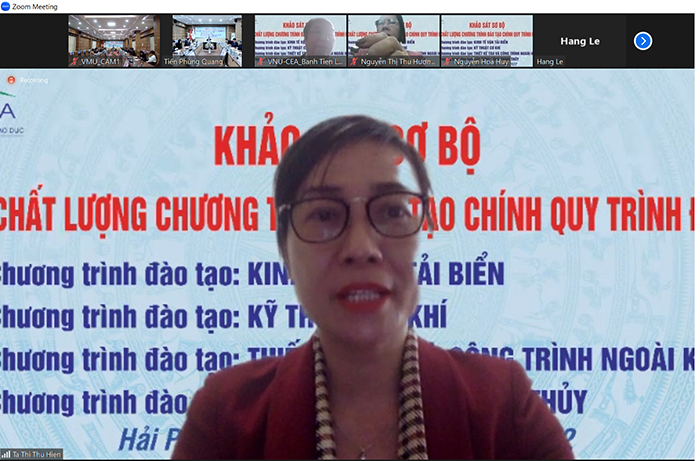 Sáng ngày 05/12/2022, Trung tâm Kiểm định chất lượng giáo dục - Đại học Quốc gia Hà Nội (KĐCLGD - ĐHQGHN) phối hợp cùng Trường Đại học Hàng hải Việt Nam khảo sát sơ bộ đánh giá chất lượng chương trình đào tạo chính quy trình độ đại học cho 04 chương trình đào tạo: Kinh tế Vận tải biển, Kỹ thuật cơ khí, Thiết kế tàu và Công trình ngoài khơi, Xây dựng Công trình thủy. Buổi Khảo sát sơ bộ diễn ra theo hình thức online trên nền tảng Zoom.
