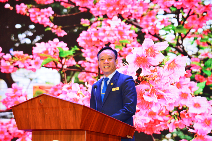 PGS.TS. Phạm Xuân Dương - Hiệu trưởng Nhà trường phát biểu tại buổi Gặp mặt Hội Cựu giáo chức Trường ĐHHH Việt Nam nhân dịp Xuân mới Ất Tỵ 2025