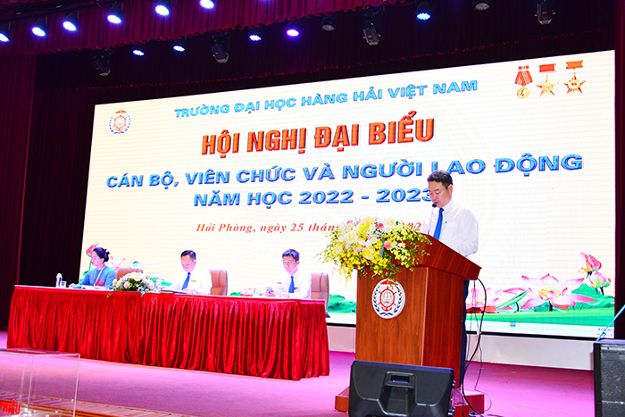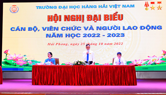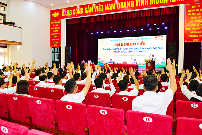 08h00 ngày 25/10/2022, tại Hội trường A8, Trường Đại học Hàng hải Việt Nam tổ chức Hội nghị đại biểu cán bộ, viên chức và người lao động năm học 2022-2023 để đánh giá kết quả thực hiện Nghị quyết Hội nghị CB, VC, NLĐ, tổng kết phong trào thi đua năm học 2021-2022, triển khai phương hướng, nhiệm vụ năm học 2022-2023, giải đáp các kiến nghị, đề xuất của CB, VC, NLĐ.