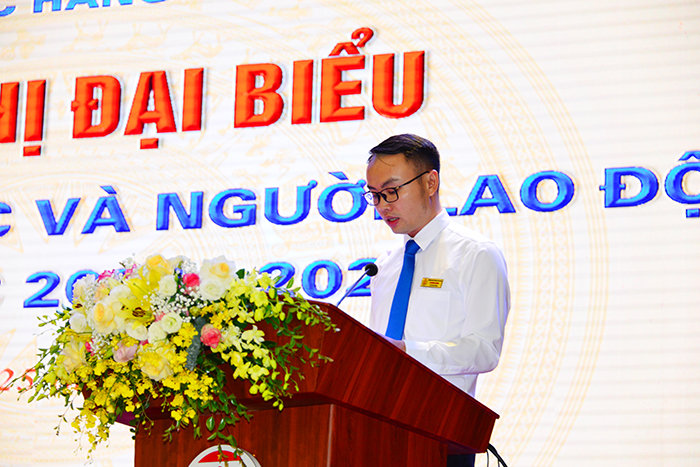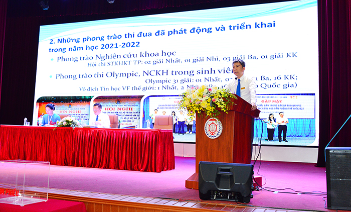 Tại Hội nghị, PGS.TS Nguyễn Công Vịnh - Ủy viên Ban Chấp hành Đảng ủy, Chủ tịch Công đoàn Trường đã Báo cáo tổng kết phong trào thi đua năm học 2021-2022; phương hướng thi đua năm học 2022-2023. Với bản lĩnh, sự kiên định trong đường lối của tập thể lãnh đạo Nhà trường, cùng sự năng động, chịu khó khắc phục khó khăn của tập thể CB, VC, NLĐ Nhà trường, mọi khó khăn đã dần lùi lại. Kết thúc một năm đầy khó khăn là những thành quả như: kiểm định thành công 8 chương trình đào tạo; việc toàn bộ CB, VC, NLĐ và sinh viên đã được tiêm đủ vacxin, không có ai bị triệu chứng nghiệm trọng; hoạt động đào tạo đảm bảo tiến độ và kết quả tuyển sinh vượt chỉ tiêu với điểm đầu vào cao vượt hơn những năm trước,…