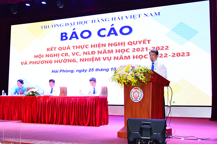 Mở đầu Hội nghị, PGS.TS Nguyễn Thanh Sơn - Phó Hiệu trưởng Nhà trường đã thay mặt Hội đồng Trường, Đảng ủy, Ban Giám hiệu báo cáo kết quả thực hiện Nghị quyết Hội nghị CB, VC và NLĐ năm học 2021-2022 và phương hướng nhiệm vụ năm học 2022-2023. Năm học 2021 - 2022 của Trường Đại học Hàng hải Việt Nam là năm thứ hai thực hiện Nghị quyết Đại hội Đại biểu toàn quốc lần thứ XIII của Đảng, Nghị quyết Đại hội Đại biểu lần thứ XVI của Đảng bộ Thành phố Hải Phòng. Đồng thời đây cũng là năm học thứ hai tiếp tục triển khai thực hiện Nghị quyết Đại hội Đảng bộ Trường khóa XXVII; năm thứ 9 thực hiện Nghị quyết số 29-NQ/TW ngày 04/11/2013 Hội nghị BCH TW lần thứ 8, khóa XI về “Đổi mới căn bản, toàn diện giáo dục và đào tạo, đáp ứng yêu cầu công nghiệp hóa, hiện đại hóa trong điều kiện kinh tế thị trường định hướng xã hội chủ nghĩa và hội nhập quốc tế”, Nghị quyết số 50/NQ-CP ngày 20/5/2021 của Chính phủ về Nhiệm vụ của Ngành GD&ĐT trong chương trình hành động của Chính phủ thực hiện Nghị quyết Đại hội Đại biểu toàn quốc lần thứ XIII của Đảng; Luật sửa đổi bổ sung một số điều của Luật Giáo dục Đại học, Luật Viên chức có hiệu lực thi hành; năm thứ hai Trường tự chủ chi thường xuyên theo QĐ của Bộ GTVT. Năm học 2021-2022 cũng là năm học gặp nhiều khó khăn trong bối cảnh nền kinh tế thế giới có nhiều biến động; nền kinh tế đất nước đang trên đà phát triển, nhưng vẫn còn nhiều thách thức. Toàn Đảng, toàn dân đang quan tâm nhiều đến nhu cầu cấp bách phải đổi mới toàn diện, triệt để nền giáo dục và đào tạo nước nhà. Đặc biệt bước sang năm thứ ba, toàn thế giới trong đó có nước ta đang phải gánh chịu hậu quả nặng nề do đại dịch Covid - 19 bùng phát và lan rộng.