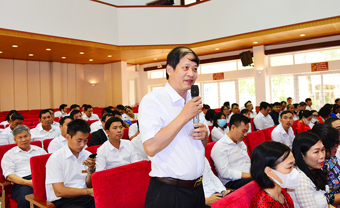 PGS.TS. Phạm Xuân Dương - Phó Bí thư Đảng ủy, Hiệu trưởng Nhà trường chủ trì phần hỏi đáp trực tiếp các ý kiến của các đại biểu tại Hội nghị
