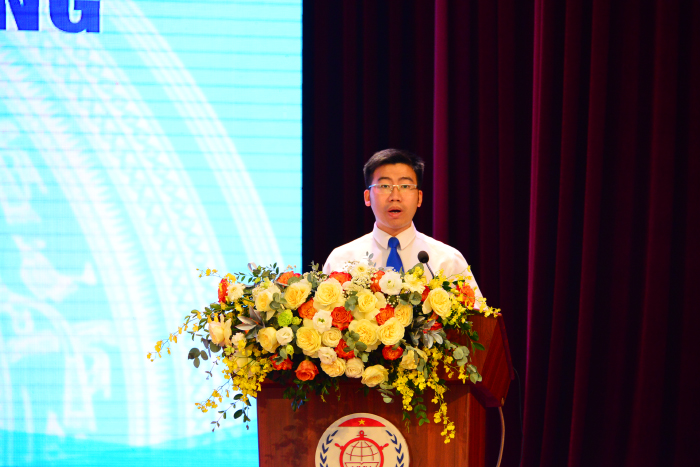 Đồng chí Ngô Việt Anh - Phó Bí thư Đoàn, Chủ tịch Hội sinh viên Trường thay mặt Đoàn thư ký thông qua Dự thảo Nghị quyết Hội nghị