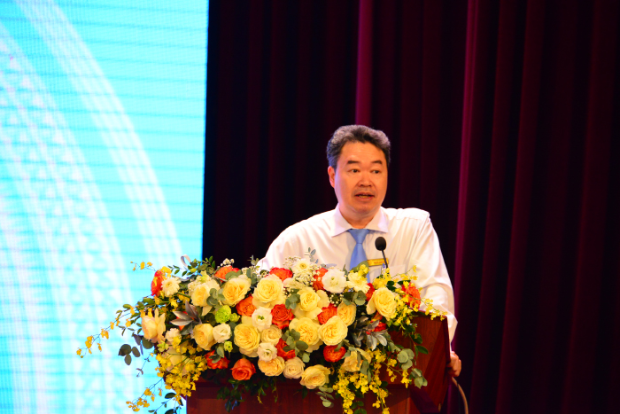 PGS.TS. Nguyễn Công Vịnh - Ủy viên Ban Chấp hành Đảng bộ, Chủ tịch Công đoàn Trường báo cáo tổng kết phong trào thi đua năm học 2023-2024 và phát động thi đua năm học 2024-2025