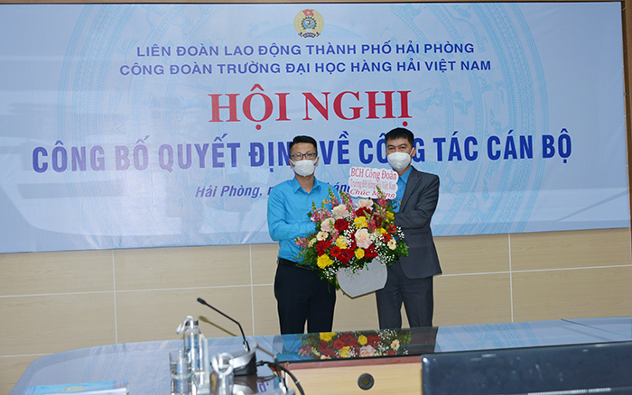 Lãnh đạo Liên đoàn Thành phố và Trường Đại học Hàng hải Việt Nam tặng hoa chúc mừng Tân Phó chủ tịch Công đoàn.