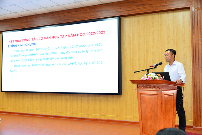 Đồng chí Vũ Minh Ngọc - Phó trưởng phòng, Phụ trách Phòng Công tác sinh viên báo cáo tổng kết công tác CVHT năm 2022-2023 và phương hướng, nhiệm vụ công tác CVHT năm học 2023-2024