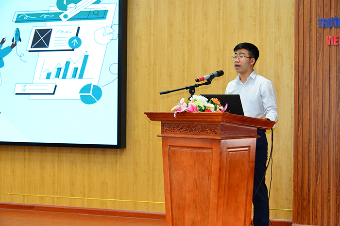 ThS. Ngô Việt Anh - Phó Bí thư Đoàn TNCS HCM, Chủ tịch Hội sinh viên Trường trình bày tham luận: “Các giải pháp nâng cao hiệu quả việc phối hợp giữa Ban cán sự chi đoàn, chi hội và Nhóm sinh viên trong việc quản lý, tổ chức các hoạt động sinh viên”