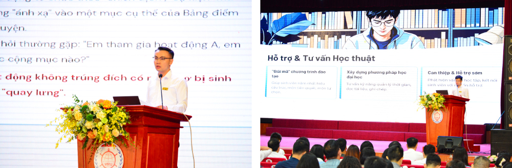 Song song đó, Nhà trường đẩy mạnh cải cách hành chính, vận hành hiệu quả Cổng dịch vụ “Một cửa” và ứng dụng VMU Connect. Việc đưa vào sử dụng các nền tảng số này đã bước đầu mang lại hiệu quả tích cực, hỗ trợ đội ngũ CVHT trong quản lý, tư vấn và kết nối thông tin với sinh viên - phụ huynh, góp phần nâng cao chất lượng phục vụ và sự hài lòng của người học.