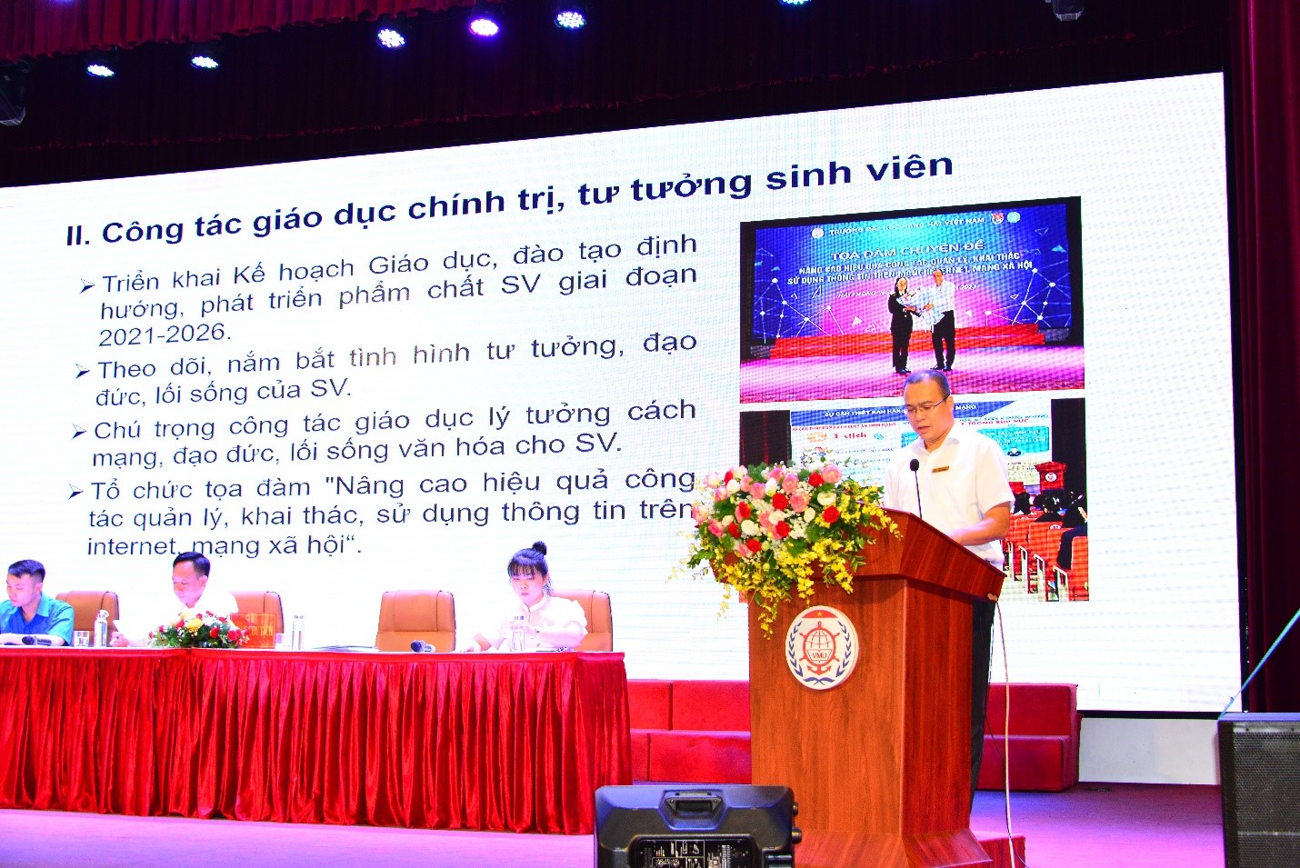 Hội nghị đã tổng kết, đánh giá những hoạt động trong năm học 2022-2023 và đưa ra định hướng nhiệm vụ trọng tâm năm học 2023-2024. Tại Hội nghị, thay mặt Đoàn Chủ tịch, Hiệu trưởng Phạm Xuân Dương đã lắng nghe, giải đáp hàng chục ý kiến thắc mắc, ghi nhận rất nhiều góp ý, đề xuất từ phía sinh viên Nhà trường về tất cả các mặt công tác: giảng dạy và học tập, rèn luyện, nghiên cứu khoa học, cơ sở vật chất phục vụ giảng dạy, học tập, các dịch vụ trong Trường dành cho sinh viên, các hoạt động ngoại khoá, các chương trình học bổng, quan hệ giữa Nhà trường và doanh nghiệp để tạo cơ hội thực tập, thực hành, cơ hội việc làm của sinh viên sau tốt nghiệp; tinh thần, thái độ phục vụ sinh viên của một số đơn vị, phòng ban chức năng; công tác bảo đảm an ninh, an toàn cho sinh viên trong trường...