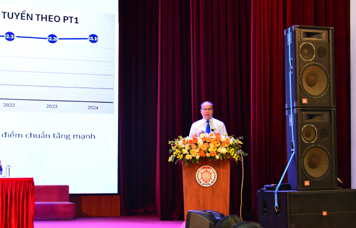 PGS.TS. Nguyễn Minh Đức - Phó Hiệu trưởng Nhà trường báo cáo tổng kết những hoạt động trong năm học 2023-2024 và phương hướng nhiệm vụ trọng tâm năm học 2024-2025