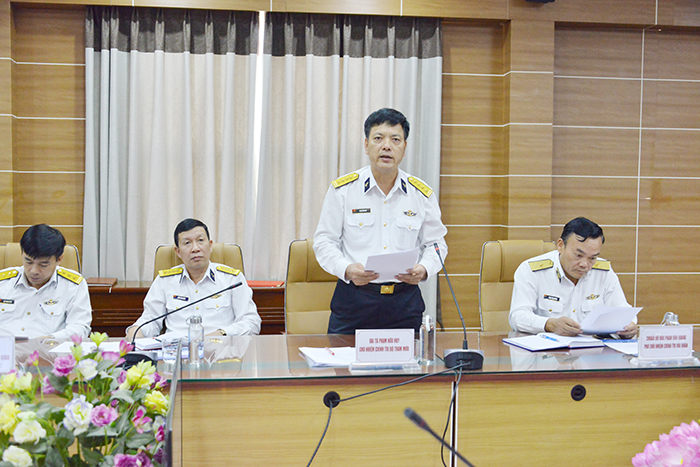 Đại tá Phạm Hữu Huy, Chủ nhiệm Chính trị, Bộ Tham mưu trình bày Báo cáo tổng kết Chương trình phối hợp hoạt động giai đoạn 2015 - 2020, phương hướng phối hợp hoạt động giai đoạn 2020 - 2025 giữa Trường Đại học Hàng hải Việt Nam và Bộ Tham mưu Hải quân.