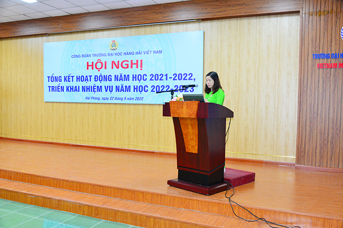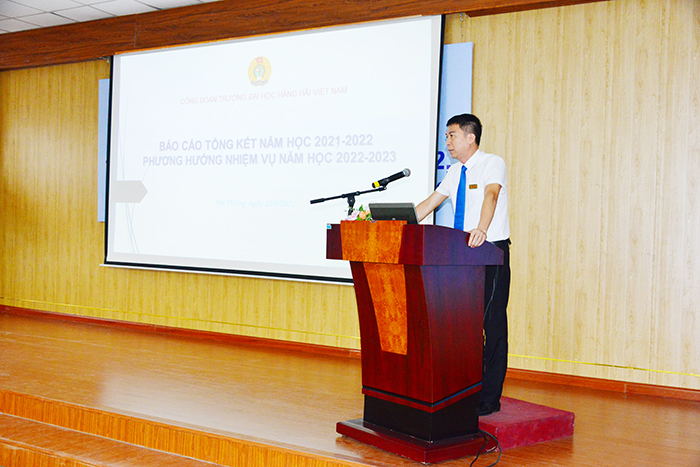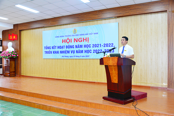 Hội nghị được nghe PGS.TS. Nguyễn Công Vịnh - Chủ tịch Công đoàn Trường trình bày báo cáo Tổng kết hoạt động Công đoàn năm học 2021 - 2022, triển khai nhiệm vụ năm học 2022- 2023 đồng thời chủ trì phần thảo luận của Hội nghị. Năm học 2021-2022 là năm thứ hai thực hiện Nghị quyết Đại hội đại biểu toàn quốc lần thứ XIII của Đảng, Nghị quyết Đại hội Đảng bộ TP Hải Phòng lần thứ XVI và Nghị quyết Đại hội Đảng bộ Trường lần thứ XXVII nhiệm kỳ 2020-2025; là năm thứ tư thực hiện Nghị quyết Đại hội XIV Công đoàn thành phố, Đại hội XII Công đoàn Việt Nam; năm thứ hai thực hiện Nghị quyết 02/NQ-TW Bộ Chính trị về “Đổi mới tổ chức và hoạt động Công đoàn trong tình hình mới”; năm thứ hai Trường thực hiện tự chủ chi thường xuyên theo Quyết định của Bộ GTVT đã có những tác động nhất định đến hoạt động của Công đoàn Trường. Bên cạnh đó, dịch bệnh Covid-19 tiếp tục diễn biến phức tạp tác động đến nền kinh tế của đất nước cũng ảnh hưởng đến việc triển khai hoạt động của các cấp công đoàn.