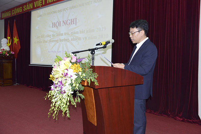 Mở đầu Hội nghị, đồng chí Hoàng Văn Thủy – Phó Bí thư Đảng ủy Trường Đại học Hàng hải Việt Nam đã báo cáo kết quả công tác kiểm tra, giám sát, thi hành kỷ luật trong Đảng năm 2019 và đề ra những phương hướng nhiệm vụ năm 2020. Năm 2019 là năm thứ tư tiếp tục thực hiện nghị quyết đại hội Đảng bộ các cấp nhiệm kỳ 2015-2020. Tình hình chính trị, kinh tế, xã hội của đất nước và thành phố Hải Phòng có nhiều khởi sắc. Đây cũng là năm Đảng bộ Trường Đại học Hàng hải Việt Nam tiếp tục tập trung chỉ đạo thực hiện sứ mạng là “Trường Đại học đa ngành nghề có uy tín trong khu vực và thế giới; đào tạo nguồn nhân lực cho ngành kinh tế biển và xã hội, phục vụ công cuộc xây dựng đất nước và hội nhập quốc tế”, đồng thời phát huy tinh thần đoàn kết trong tập thể cán bộ, đảng viên, giảng viên, sinh viên Nhà trường, để lãnh đạo, chỉ đạo thực hiện chủ đề công tác năm 2019, đó là “Tiếp tục kiện toàn bộ máy quản lý, đảm bảo hoạt động tinh gọn, nâng cao năng lực, trách nhiệm công vụ của đội ngũ chuyên viên, giảng viên, thực hiện có hiệu quả công tác cải cách thủ tục hành chính, tăng cường tiết kiệm, chỗng lãng phí để tạo đột phá trong đào tạo, NCKH và hợp tác quốc tế”.
