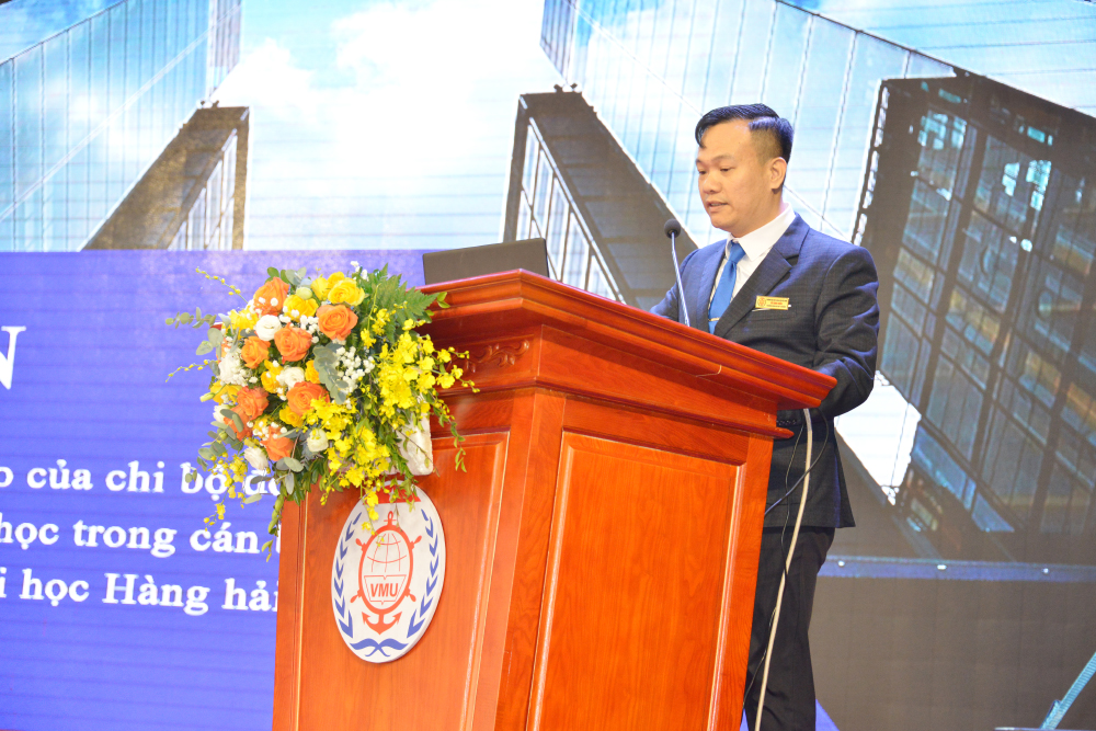 Đồng chí Vũ Anh Tuấn - Bí thư Chi bộ, Trưởng khoa Cơ sở - Cơ bản trình bày báo cáo tham luận: “Phát huy vai trò lãnh đạo, chỉ đạo của Chi bộ đối với việc thúc đẩy phong trào nghiên cứu khoa học trong cán bộ, giảng viên tại Khoa Cơ sở - Cơ bản, Trường Đại học Hàng hải Việt Nam.”