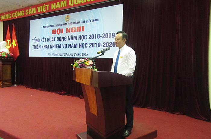 Dưới sự chủ trì của đồng chí Phạm Ngọc Tuyền – Chủ tịch Công đoàn Trường, Hội nghị được nghe đồng chí Phạm Thu Thưởng- UV BCH LĐLĐ TP Hải Phòng, Phó Chủ tịch thường trực Công đoàn Trường thay mặt Ban Chấp hành trình bày báo cáo tổng kết hoạt động công đoàn năm học 2018-2019 và phương hướng, nhiệm vụ năm học 2019-2020. Theo báo cáo, năm học 2018-2019 là năm đầu thực hiện Nghị quyết Đại hội XIV Công đoàn thành phố, Đại hội XII Công đoàn Việt Nam; là năm toàn Ngành Giáo dục sơ kết 5 năm thực hiện Nghị quyết 29-NQ/TW về đổi mới căn bản, toàn diện giáo dục và đào tạo. Năm học 2018-2019, các cấp Công đoàn của Trường đã phát động nhiều phong trào thi đua chào mừng kỷ niệm 90 năm thành lập Công đoàn Việt Nam (28/7/1929-28/7/2019). Toàn Trường tích cực thi đua, đổi mới nội dung chương trình đào tạo và phương pháp đánh giá kết quả học tập của sinh viên, xây dựng và triển khai chương trình đào tạo theo phương pháp tiếp cận CDIO nhằm từng bước cải tiến chất lượng dịch vụ đào tạo hướng đến người học, xây dựng chương trình theo chuẩn quốc tế AUN nhờ đó nâng cao chất lượng đào tạo, góp phần hoàn thành xuất sắc nhiệm vụ năm học.