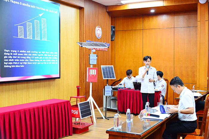 Khoa Điện - Điện tử | SV23-24.27 | Nghiên cứu, thiết kế và chế tạo hệ thống cảnh báo cháy sớm và giám sát chất lượng môi trường đảm bảo an toàn phòng chống cháy nổ tại khu vực kho hàng, cảng biển | Phạm Hoàng Anh | TĐH62ĐH | ThS. Nguyễn Văn Hùng | Giải Nhất |