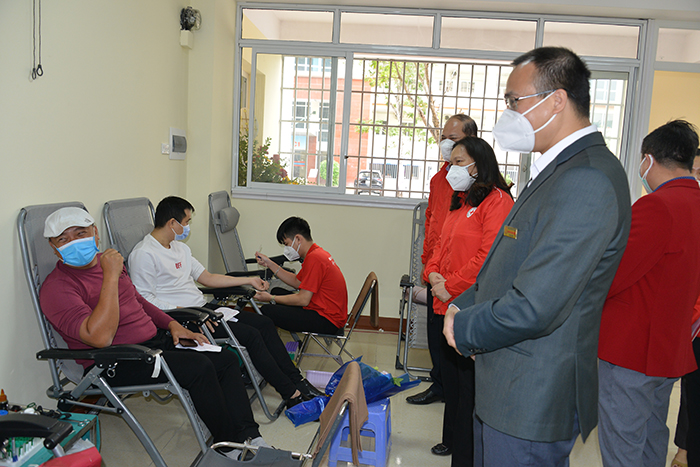 Lãnh đạo Hội Chữ thập đỏ Thành phố và lãnh đạo Nhà trường động viên tình nguyện viên tham gia hiến máu.