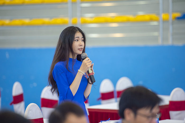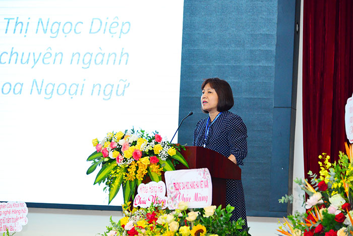 Bà Hoàng Thị Ngọc Diệp - Giảng viên Bộ môn Tiếng Anh chuyên ngành, Khoa Ngoại ngữ phát biểu tham luận: “Thực trạng và giải pháp nâng cao hiệu quả giảng dạy Tiếng Anh cho sinh viên chuyên ngành Khai thác Máy tàu biển”.