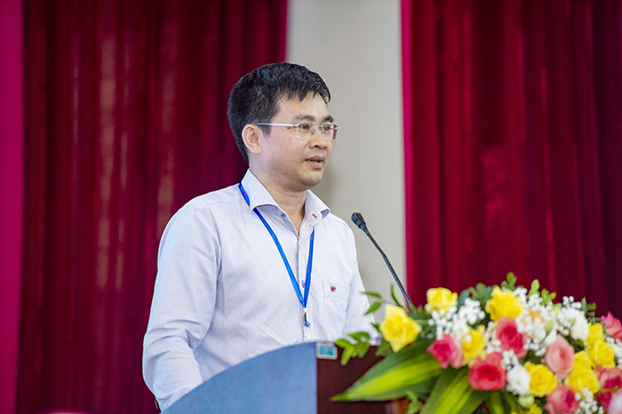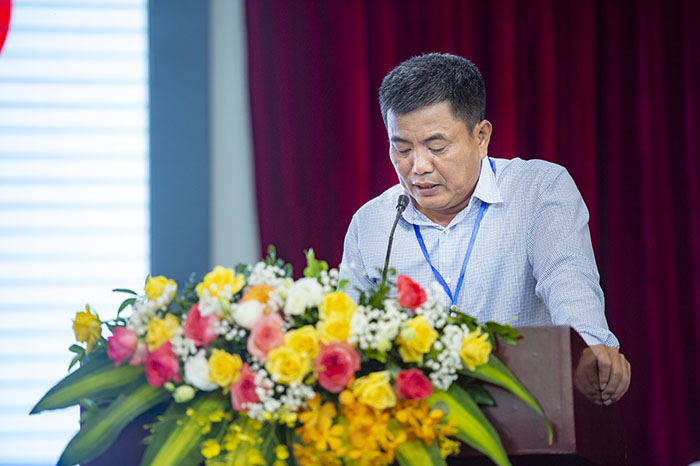 Ông Hoàng Văn Dương - Giám đốc Công ty Cổ phần Hàng hải Liên minh phát biểu với tham luận: “Đổi mới đào tạo ngành Máy tàu biển đáp ứng yêu cầu thực tiễn”.