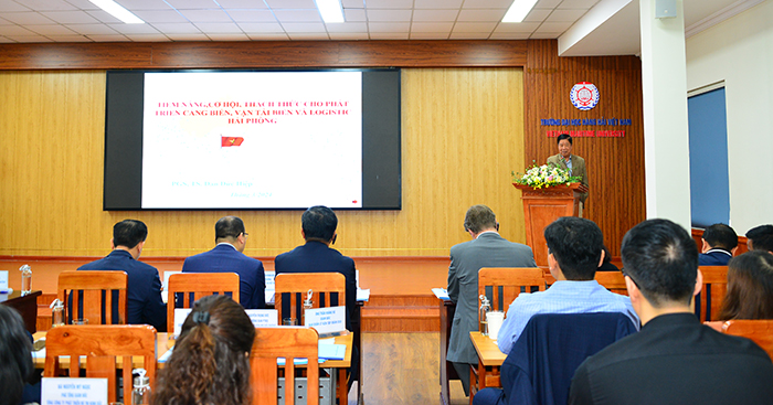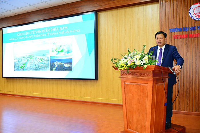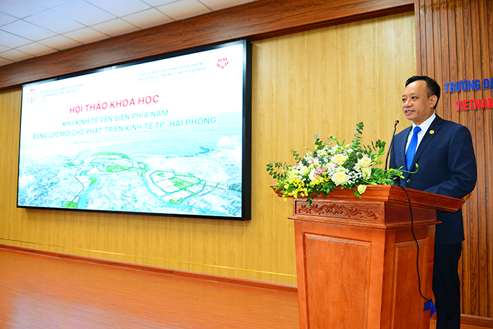 Phát biểu khai mạc Hội thảo khoa học, PGS.TS. Phạm Xuân Dương - Hiệu trưởng Nhà trường nhấn mạnh về một trong ba nhiệm vụ trọng tâm phát triển Hải Phòng thời kỳ 2021-2030 là thành lập khu kinh tế ven biển phía Nam gắn với dịch vụ cảng biển và logistics. Đây là định hướng rất quan trọng, cấp thiết và đúng đắn của Hải Phòng nhằm tận dụng tốt nhất các cơ hội, phát huy tiềm năng lợi thế, tạo dư địa phát triển rộng mở trong nhiều năm tới; và đó cũng nằm trong những thế mạnh của Trường Đại học Hàng hải Việt Nam.