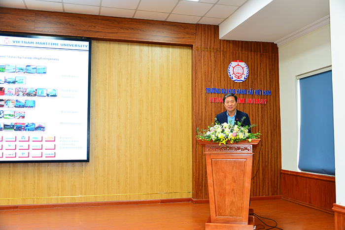 PGS.TS. Đan Đức Hiệp - nguyên Phó chủ tịch UBND thành phố Hải Phòng trình bày chuyên đề: Phát triển khu kinh tế ven biển phía Nam - thời cơ, thách thức đối với ngành cảng biển, vận tải biển và logistics