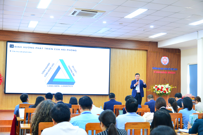 Ông Bùi Ngọc Hải phát biểu tại Hội thảo với chủ đề: “Thành phố Hải Phòng - Trung tâm logistics trọng điểm quốc gia & quốc tế: Cơ hội và thách thức”, nhấn mạnh định hướng phát triển của Hải Phòng: Trung tâm cảng biển và logistics quốc gia, quốc tế; Trung tâm công nghệ cao, chế biến chế tạo; Trung tâm khoa học, đổi mới sáng tạo; Trung tâm năng lượng tái tạo; Khu kinh tế xanh, sinh thái, tuần hoàn. Diễn giả đã định hướng các vấn đề cần tập trung nghiên cứu trong thời gian tới: Định vị logistics Hải Phòng; Mô hình và chiến lược phát triển logistics; Thu hút các hãng tàu và tập đoàn logistics lớn;