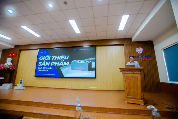 Ông Lương Sĩ Tuấn - Tổng Giám đốc Công ty cổ phần V-lite Panel Hòa Bình giới thiệu về sản phẩm gạch bê tông bọt tự khóa