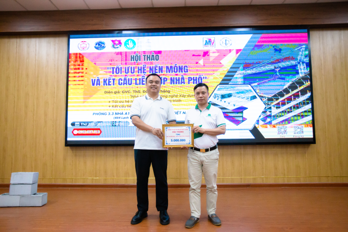 Từ năm 2011, nhằm khuyến khích, động viên các sinh viên có thành tích cao trong học tập, nghiên cứu khoa học, Khoa Công trình đã thành lập “Quỹ khuyến học” và thường xuyên nhận được sự ủng hộ của các Doanh nghiệp, các cựu sinh viên. Trong chương trình Hội thảo, sau khi kết thúc phần báo cáo, trao đổi, ký kết chuyển giao công nghệ, ông Phạm Văn Huyên đại diện Công ty TNHH thiết kế Xây dựng và Đầu tư Minh Vinh, ông Đào Huy Lộc - Giám đốc Công ty cổ phần công trình Nhà Việt, ông Nguyễn Hồng Sơn - Giám đốc Công ty cổ phần Xây dựng Hải Thành đã trao quà ủng hộ cho “Quỹ khuyến học” - tổng số tiền là 15.000.000đ cùng 30 voucher khóa học phần mềm ứng dụng tại Trung tâm Tin học HDJ thuộc Công ty TNHH Thiết kế Xây dựng và Đầu tư Minh Vinh với mong muốn cùng Khoa Công trình hỗ trợ thêm cho các sinh viên đam mê học tập, nghiên cứu khoa học.