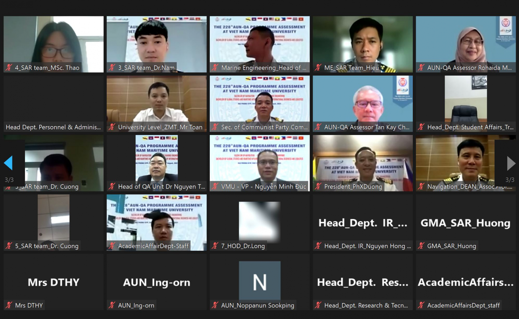 08h00 (giờ Việt Nam) ngày 16/8/2021, tại Trường Đại học Hàng hải Việt Nam đã diễn ra Phiên Khai mạc đợt đánh giá ngoài từ xa của 04 chương trình đào tạo theo tiêu chuẩn AUN-QA lần thứ 228. Phiên Khai mạc được tổ chức theo hình thức trực tuyến với sự tham dự của TS. Choltis Dhirathiti - Giám đốc điều hành Mạng lưới các Trường Đại học Đông Nam Á (AUN); GS.TS Rosemary Seva (Philippines), Trưởng đoàn đánh giá AUN-QA; các đánh giá viên chính gồm: PGS.TS. Tan Kay Chuan (Singapore), GS.TS. Patricia Empleo (Philippines), GS.TS. Rosemary Seva (Philippines), PGS.TS. Pornpun Prajaknate (Thái Lan), GS.TS. Rohaida Mohd. Saat (Malaysia), PGS.TS. Amphawan Julsereewong (Thái Lan), TS. Maria Elissa J.Lao (Philippines), TS. Attachai Ueranantasun (Thái Lan); Ban Thư ký AUN-QA gồm: bà Monsiri Chintanavisit và ông Korn Ratanagosoom.