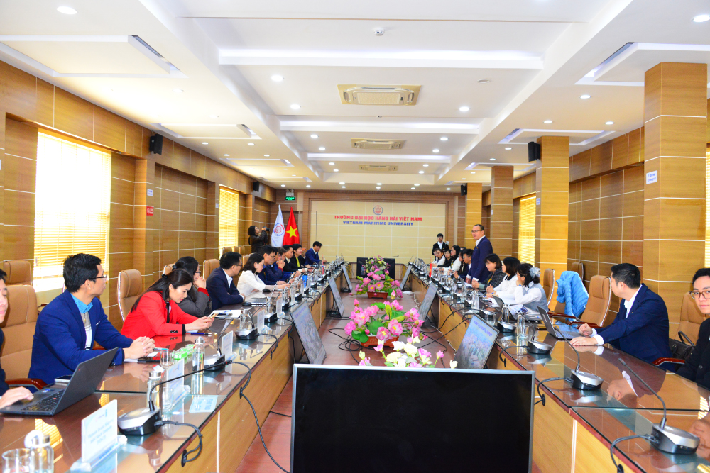 Tiếp Đoàn tại Phòng khách Nhà trường, PGS.TS. Nguyễn Minh Đức - Phó Hiệu trưởng Trường Đại học Hàng hải Việt Nam đã giới thiệu tổng quan về năng lực đào tạo cũng như những thế mạnh chuyên môn của Nhà trường, đặc biệt trong các lĩnh vực đào tạo gắn với ngành nghề đi biển. Đồng thời, thầy Phó Hiệu trưởng cũng chia sẻ về xu hướng xanh hóa hệ thống giao thông vận tải tại Việt Nam, thể hiện sự quan tâm ngày càng lớn của Việt Nam đối với mục tiêu phát triển bền vững, nhất là trong lĩnh vực hàng hải.