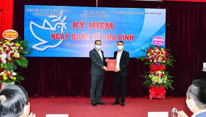 Sáng 26/10, Liên hiệp các tổ chức hữu nghị thành phố Hải Phòng, Ủy ban Hòa bình thành phố Hải Phòng và Trường Đại học Hàng hải Việt Nam cùng phối hợp tổ chức kỷ niệm Ngày Quốc tế hòa bình năm 2021 nhằm truyền tải thông điệp bảo vệ, giữ gìn hòa bình, xây dựng và bảo vệ Tổ quốc trước những thách thức lớn của đại dịch Covid-19 và những nỗ lực hoàn thành nhiệm vụ năm 2021, đóng góp tích cực vào phát triển kinh tế-xã hội Thành phố.