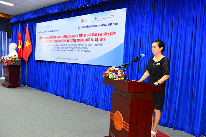 Bà Vũ Thị Đủ và bà Đinh Thị Thúy Anh, đại diện nhà tài trợ đã chia sẽ những hoạt động và ý nghĩa của Dự án, hy vọng Dự án sẽ mang đến cho sinh viên Nhà trường những cơ hội học tập, phát triển, nâng cao kiến thức và kĩ năng của bản thân, mang đến những hướng đi mới để các em sinh viên vượt lên khó khăn hiện tại, xây dựng cuộc sống tốt đẹp hơn trong tương lai. Bên cạnh đó, việc thực hiện Dự án góp phần quan trọng trong việc khẳng định mối quan hệ hợp tác hữu nghị giữa Trường Đại học Hàng hải Việt Nam, người dân Thành phố Hải Phòng, nhân dân Việt Nam với nhân dân Hàn Quốc, trong đó có tập đoàn LG Hàn Quốc.