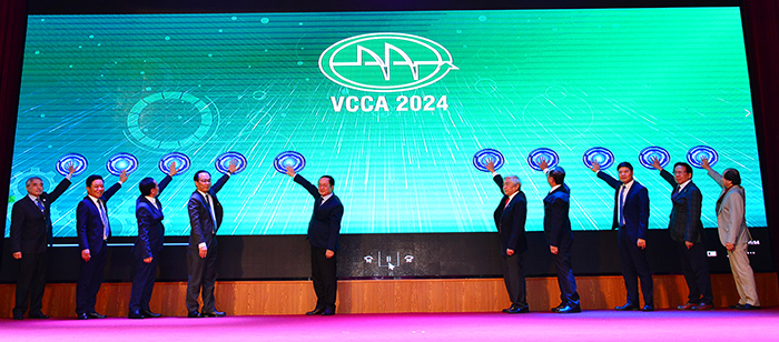 Các đại biểu thực hiện nghi lễ ấn nút khai mạc Hội nghị khoa học và Diễn đàn doanh nghiệp - VCCA 2024