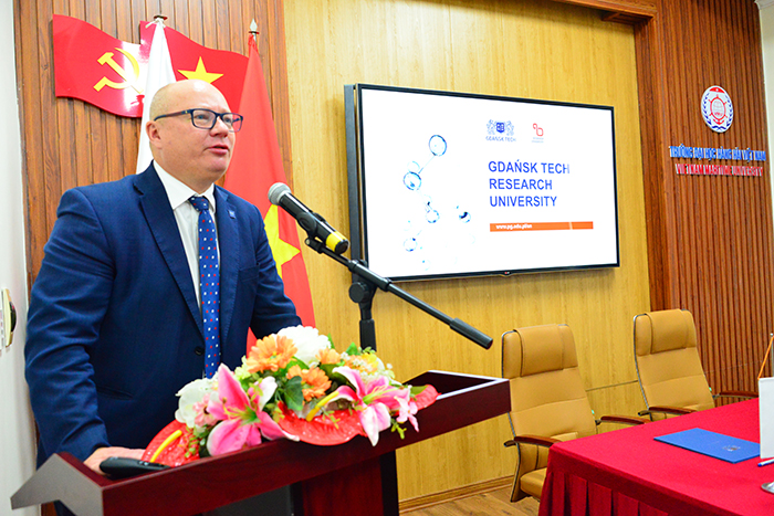 Phát biểu tại buổi làm việc, GS. Krzysztof Wilde cho biết bản thân rất ấn tượng về năng lực đào tạo, cơ sở vật chất và kinh nghiệm hợp tác quốc tế của Nhà trường. Bên cạnh đó, Ông cũng giới thiệu về lịch sử lâu đời của Trường Đại học Công nghệ Gdańsk, từ khi được thành lập vào năm 1904, đến nay Trường đã vinh dự được xếp thứ 2 trong số 10 trường trọng điểm tại Ba Lan.