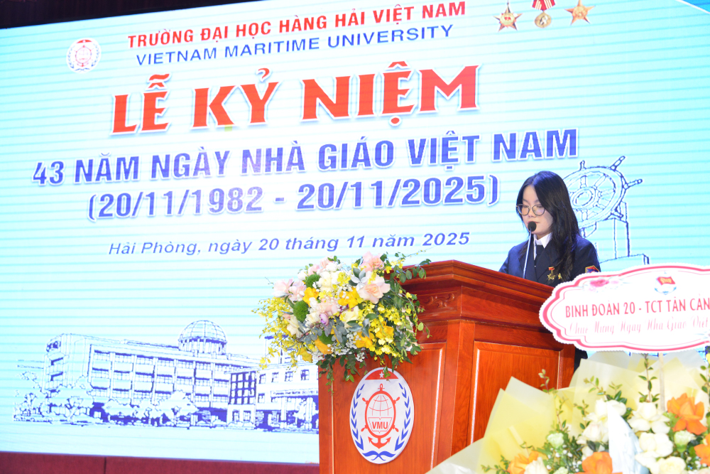 Sáng 20/11/2025, Trường Đại học Hàng hải Việt Nam đã tổ chức: “Lễ Kỷ niệm 43 năm ngày Nhà giáo Việt Nam” (20/11/1982 - 20/11/2025). Tới dự và chung vui với thầy và trò Trường Đại học Hàng hải Việt Nam có đồng chí Nguyễn Minh Hùng - Phó Chủ tịch UBND thành phố Hải Phòng; đồng chí Đỗ Thị Phong Lan - Phó Vụ trưởng Vụ Tổ chức cán bộ, Bộ Xây dựng; các Thầy, Cô nguyên là lãnh đạo Trường, nguyên cán bộ chủ chốt Nhà trường qua các thời kỳ, Ban Chấp hành Hội Cựu giáo chức và đại diện Câu lạc bộ truyền thống Trường Đại học Hàng hải Việt Nam tại thành phố Hồ Chí Minh, các Nhà giáo nhân dân, Nhà giáo ưu tú, cùng các thầy, cô giáo đại diện cho hơn 900 cán bộ, giảng viên của Nhà trường