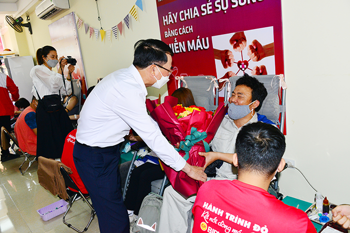 Đồng chí Lê Khắc Nam – Thành ủy viên, Phó Chủ tịch Ủy ban nhân dân Thành phố, Trưởng ban chỉ đạo vận động hiến máu tình nguyện TP.Hải Phòng tặng hoa động viên các thành viên HMTN.