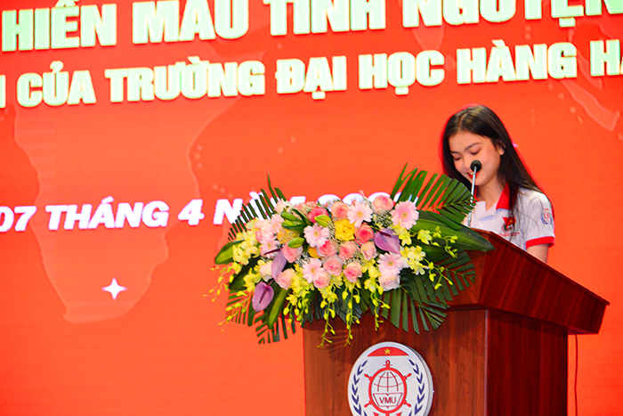 Sinh viên Vũ Tuệ Nhi – sinh viên lớp ĐKT61CH, thành viên CLB Hiến máu tình nguyện Trường ĐH Hàng hải Việt Nam, đại diện người tham gia hiến máu lên phát biểu hưởng ứng