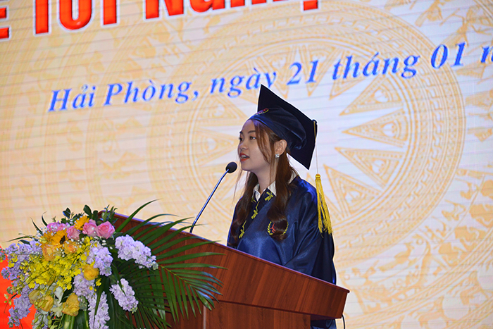 Trong niềm vui ngày tốt nghiệp, tân cử nhân Nguyễn Yến Linh lớp IBL07 đại diện cho các tân cử nhân, kỹ sư phát biểu, bày tỏ lòng biết ơn sâu sắc tới Ban lãnh đạo Nhà trường, lãnh đạo các phòng, ban, khoa, viện, các cán bộ , chuyên viên, các thầy cô giáo vì đã luôn đồng hành cùng sinh viên trong suốt những năm qua không chỉ trong học tập mà còn qua các phong trào đầy bổ ích; đồng thời gửi lời cảm ơn các thế hệ thầy trò Nhà trường đã gây dựng lên Trường Đại học Hàng hải Việt Nam vững mạnh, trở thành niềm tin và ước vọng của bao thế hệ sinh viên sau này. “Hơn 4 năm qua chỉ là sự khởi đầu cho quãng đường rất dài phía trước, vì vậy hãy lấy thành công của ngày hôm nay là bước đà vững mạnh cho sự phát triển bền vững trên con đường tương lai”