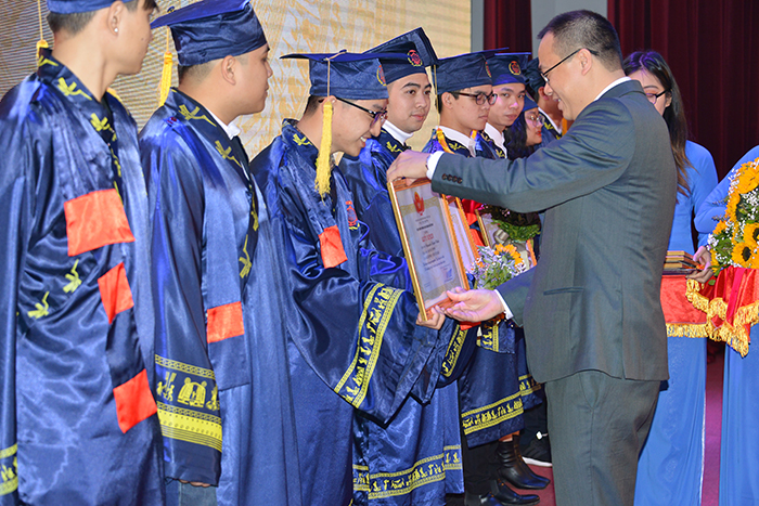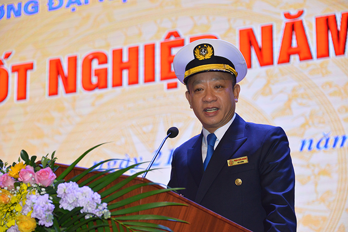 Nhân sự kiện trọng đại này, Thầy Hiệu trưởng gửi lời cảm ơn tới các thầy giáo, cô giáo, các gia đình, cũng như các đơn vị Phòng, Ban chức năng, các tổ chức đã đồng hành cùng các em sinh viên trong suốt quá trình học tập, rèn luyện tại trường để các em có thành quả như ngày hôm nay. Thầy cũng nhắn nhủ các tân cử nhân, kỹ sư: Những kiến thức mà các em học được trên ghế Nhà trường ngày hôm nay chỉ là nền tảng ban đầu, khi bước vào cuộc sống các em cần nỗ lực học nữa, học mãi, học suốt đời để vận dụng kiến thức vào thực tế. Trong bất cứ hoàn cảnh nào Thầy mong muốn các em luôn giữ vững nghị lực, ý chí, niềm tin vào chính bản thân và cuộc sống; luôn tự hào là sinh viên của Mái trường Đại dương hai lần Anh hùng.