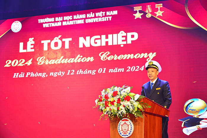 Quãng thời gian hơn bốn năm qua cả Thầy và trò chúng ta đã phải trải những học kỳ chưa từng có tiền lệ, phải đối mặt với những khó khăn, thách thức trong bối cảnh đại dịch Covid-19 và những ngày đầu của tự chủ đại học. Chúng ta đã từng lo lắng, với nhiều băn khoăn, nhiều câu hỏi, mà một trong những câu hỏi quan trọng đó là liệu các em có kịp hoàn thành toàn bộ chương trình đào tạo để tốt nghiệp đúng hạn không? Và câu trả lời ngày hôm nay là với sự đoàn kết đồng lòng, với sự kết nối và sẻ chia, với bản lĩnh, tinh thần luôn bên nhau và vượt qua tất cả. Hãy cùng nhau trân trọng và giữ vững sự kết nối ấy, tinh thần ấy bởi các em luôn có một mái nhà mang tên Mái trường Đại dương, có một gia đình mang tên Trường Đại học Hàng hải Việt Nam sẵn sàng giang tay chào đón các em như đón những đứa con đi xa trở về...”