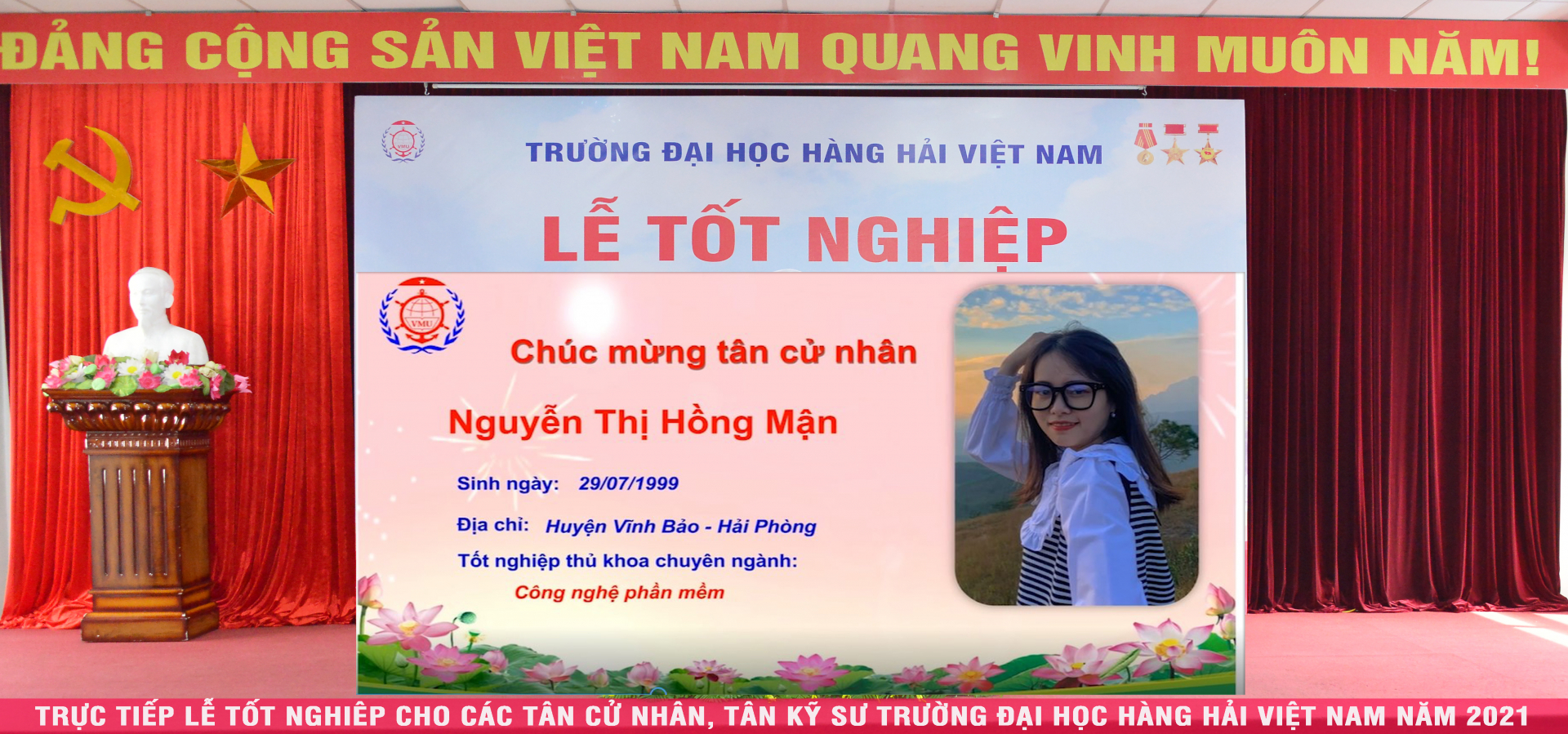 08h00 ngày 25/08/2021, Trường Đại học Hàng hải Việt Nam tổ chức Lễ Tốt nghiệp năm 2021 cho 1240 tân cử nhân, tân kỹ sư. Đây là sự kiện đánh dấu thời khắc quan trọng trong cuộc đời các em sinh viên và cũng là dấu mốc ghi lại thành quả nỗ lực học tập tại Nhà trường. Trước diễn biến phức tạp của đại dịch Covid-19, để đảm bảo an toàn, Lễ Tốt nghiệp đã được tổ chức theo hình thức trực tuyến trên mạng xã hội của Trường kết hợp với cách thức tổ chức phát bằng trực tiếp theo nhóm sinh viên dưới 20 người, đảm bảo tuân thủ chặt chẽ các yêu cầu về phòng chống dịch bệnh Covid-19.