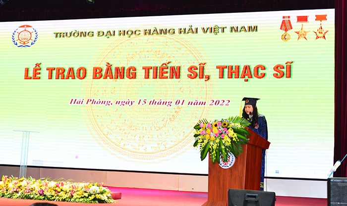 Đại diện cho các tân tiến sĩ, thạc sĩ, tân thạc sĩ Hoàng Thị Khánh Huyền -  lớp QLKT 2019.2.1 phát biểu, bày tỏ niềm vui, niềm tự hào khi được học tập và nghiên cứu dưới Mái trường Đại dương, hứa sẽ đem hết tâm lực, trí lực và kiến thức đã được đúc kết qua quá trình học tập, nghiên cứu từ Nhà trường, vận dụng một cách linh hoạt và sáng tạo vào thực tiễn. Đây cũng là cách để tri ân tới các thầy cô và Nhà trường.