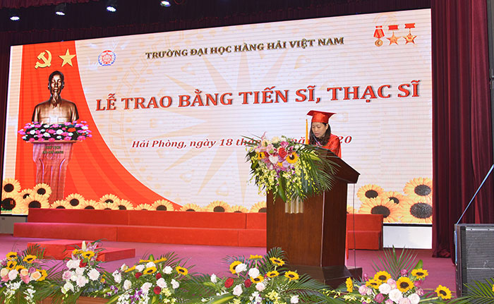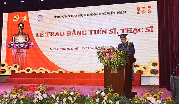 Đại diện cho các tân Tiến sĩ, Thạc sĩ được nhận Bằng Tốt nghiệp, tân Tiến sĩ Nguyễn Thị Thúy Hà và tân Thạc sĩ Đặng Văn Duy phát biểu bày tỏ lòng biết ơn sâu sắc tới các giảng viên đã tận tình giảng dạy và sự quan tâm và tạo điều kiện của lãnh đạo, các phòng ban chuyên môn của Nhà trường trong suốt quá trình học tập, nghiên cứu; đồng thời thể hiện quyết tâm đem những kiến thức được trang bị vận dụng sáng tạo vào công việc ở từng vị trí công tác, trở thành những các bộ, công dân có trí thức, góp phần phục vụ cho sự nghiệp xây dựng và phát triển đất nước, xứng đáng với danh hiệu Tiến sĩ, Thạc sĩ của Trường Đại học Hàng hải Việt Nam.